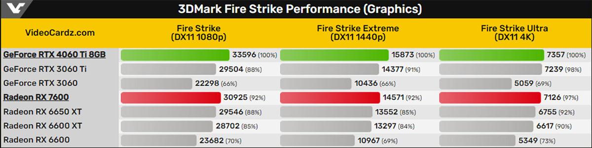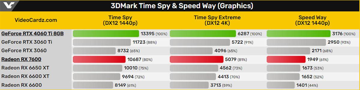RTX 4060 Ti, TimeSpy'da RX 7600'dan %24 ila %25, Speed Way'de (DX12 ile ışın izleme) ise %63 daha hızlı görünüyor. Ancak FireStrike testinde her iki kart arasında sadece tek haneli bir performans farkı var (RX 7600, RTX 4060 Ti'nın %92 ila %97'si kadar performans sunuyor).