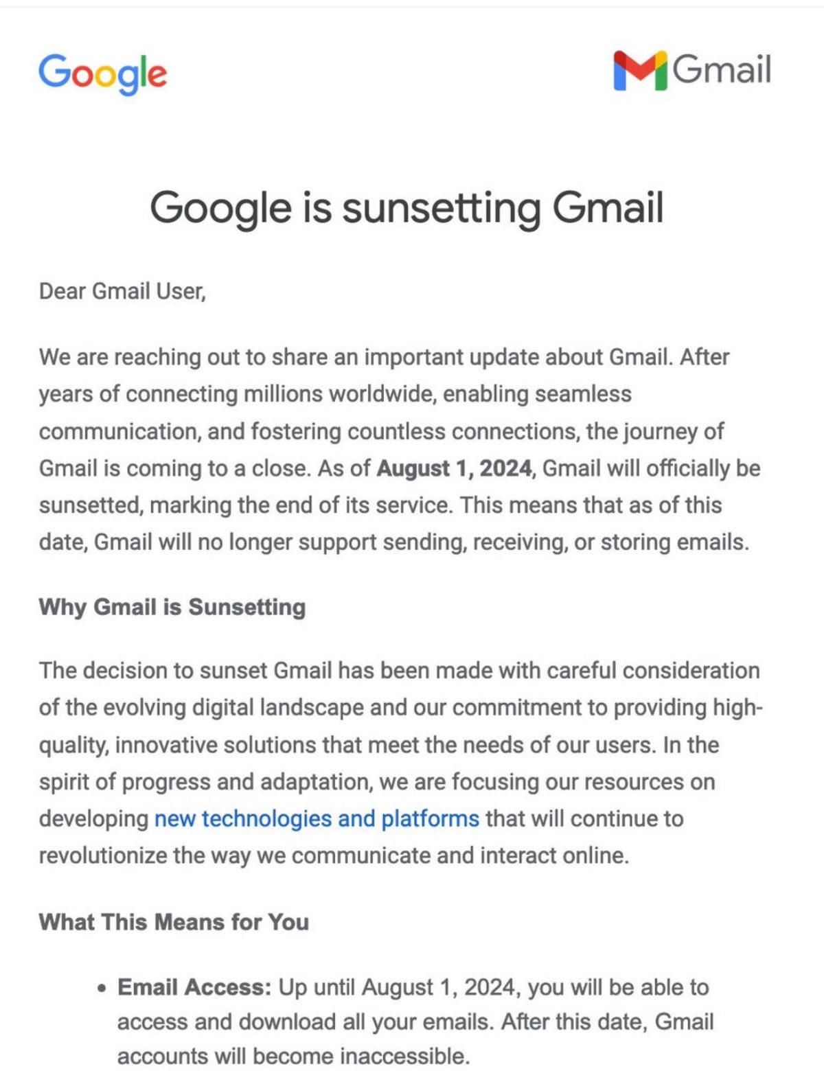 Google, en azından şu an için Gmail'i kaldırmak gibi planlama içerisinde değil. Yani yukarıda paylaştığımız e-posta, gerçeği yansıtmıyor. Olay sadece, Gmail'in HTML sürümünün kullanımdan kaldırılacak olması ile ilgili. Ancak söz konusu e-postada bu durumdan bahsedilmiyor. Bunu kimin veya kimlerin, hangi amaçla sosyal medyada yaydığı da belli değil.