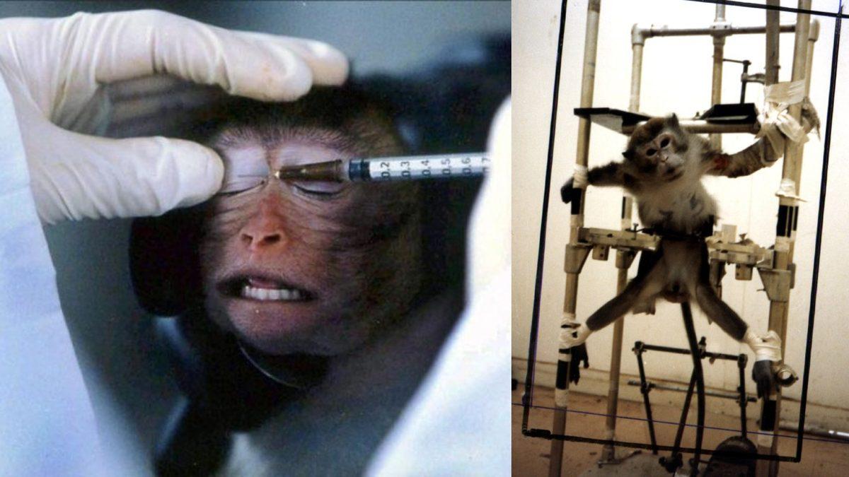 Bir makak maymununun ise deney uğruna göz kapakları dikilmiş ve doğduğu an annesinden alınmıştı.