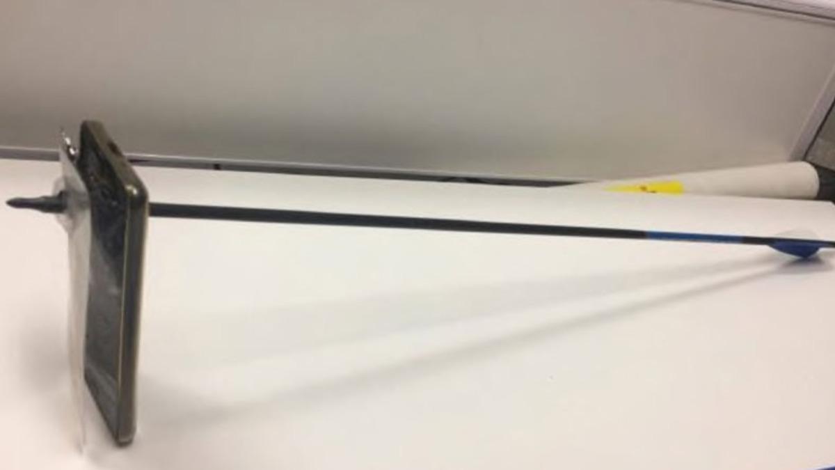 Kimliği belirsiz kurbanımız, bu sırada saldırganın fotoğrafını çekmek için iPhone'unu çıkardı. İddiaya göre saldırgan tam bu sırada 'sıradışı' silahını kullanarak kurbana bir ok fırlattı. Yaydan fırlayan ok, kurbanın elinde tuttuğu cihaza saplanarak cihazın çenesine çarpmasına sebep oldu ama iddiaya göre ateşlenen ok cihazın gövdesine saplanıp kaldı.