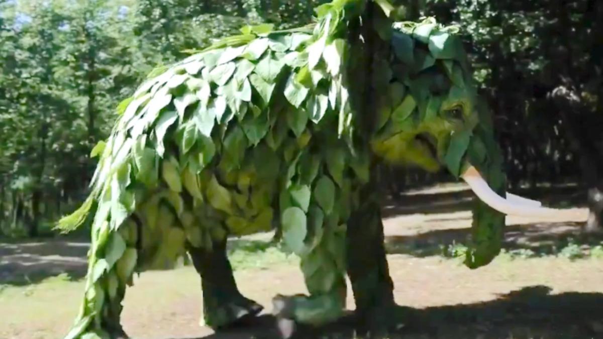 Komut: Yapraklardan yapılmış bir fil ormanda koşuşturuyor