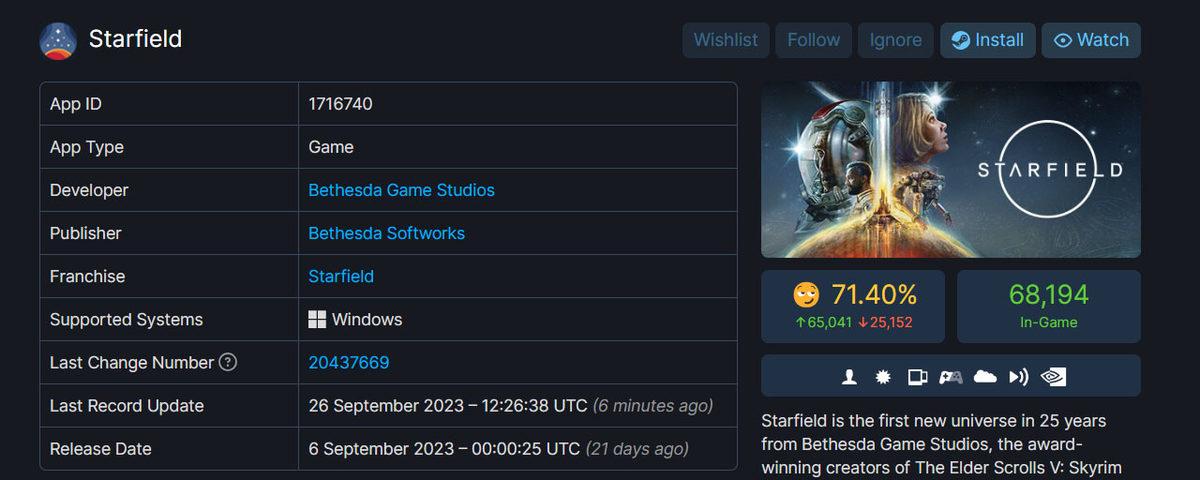 Starfield'ın Steam'deki listeleme sayfasını kontrol ettiğimizde, bu oyun için 90 bin civarında yorum yapıldığını ve bunların yüzde 72 kadarının olumlu olduğunu görüyoruz. Daha hassas verilere ulaşmak için SteamDB'de yaptığımız kontrollerde ise daha çarpıcı bir durumla karşılaşıyoruz. SteamDB'deki veriler, oyuna yapılan yorumların yüzde 71,40'ının olumlu olduğunu gözler önüne seriyor. Bu oran, Starfield'ı Bethesda'nın en az beğenilen oyunu olarak lanse edilmesine yol açtı.