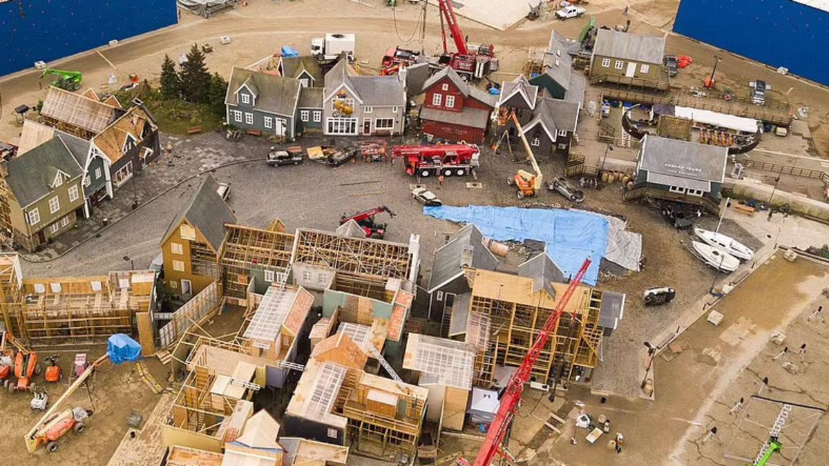 Setin etrafı, mavi panellerle çevrili durumda. Bu sayede ekip, çekimler tamamlanınca kasabayı filmde gördüğümüz haline kavuşturabilecek. Bu küçük yerleşim yeri, fotoğraflardan anlayabildiğimiz kadarıyla deniz kenarında bir yer olacak. Denizi ve karayı ayıran yerin iki beyaz botun altındaki kaldırım olduğunu açık bir şekilde görebilirsiniz.