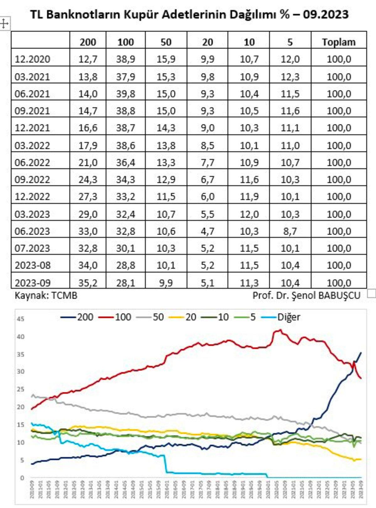 Ekonomist Şenol Babuşçu tarafından X’te paylaşılan bu tablo ve grafik gösteriyor ki Aralık 2022’den Ekim 2023’e dek geçen 22 aylık süre boyunca sadece 200 TL’lik banknotların oranında ciddi bir artış yaşandı. 10 TL’lik banknotların oranında ise %10,7’den 11,3’e yani %0,6’lık bir artış gözlemleniyor. Bu durum, artık istisnai satış noktaları hariç 0,5 litrelik bir şişe su için bile 10 TL’yi bozmak gereksiniminden kaynaklanıyor olabilir.