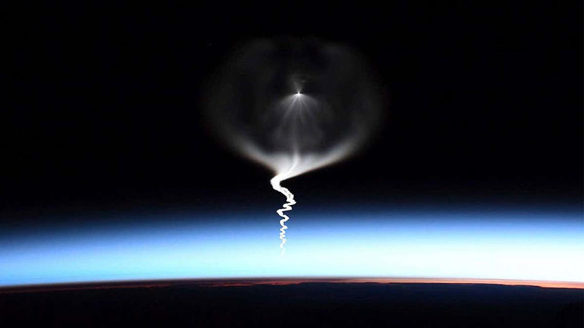 Bu muhteşem fotoğraf Soyuz’un ikinci evresinin parıldayan bir görüntüsünü gösterirken, fotoğrafta dikkatimizi çeken ilk şey ise roketten çıkan duman izi. Bu tuhaf duman izi, muhtemelen uzay aracının Dünya’dan uzaklaşmaya başladıkça yaptığı küçük rota düzeltmelerinden kaynaklanıyor. Oldukça kıvrımlı bir yapıya sahip olan duman izi, ışık ve kontrast ile birlikte sanki tuvale çizilmiş bir resim gibi görünüyor.